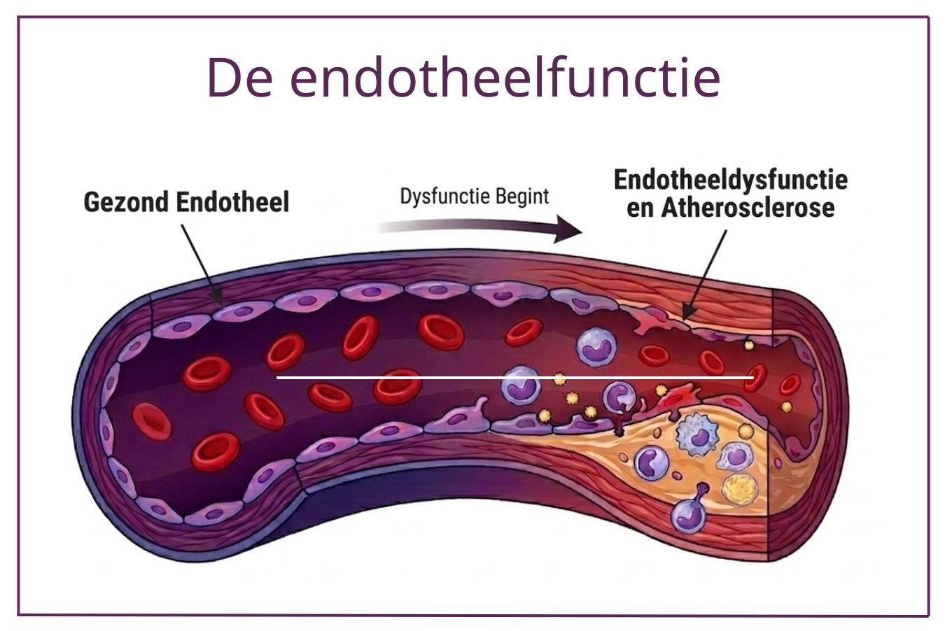 Links (Gezond Endotheel) zie je een gezonde vaatwand. De endotheelcellen (de paarse binnenlaag) liggen strak tegen elkaar aan. Het bloed stroomt ongehinderd door een brede opening en er is geen sprake van vetophoping.